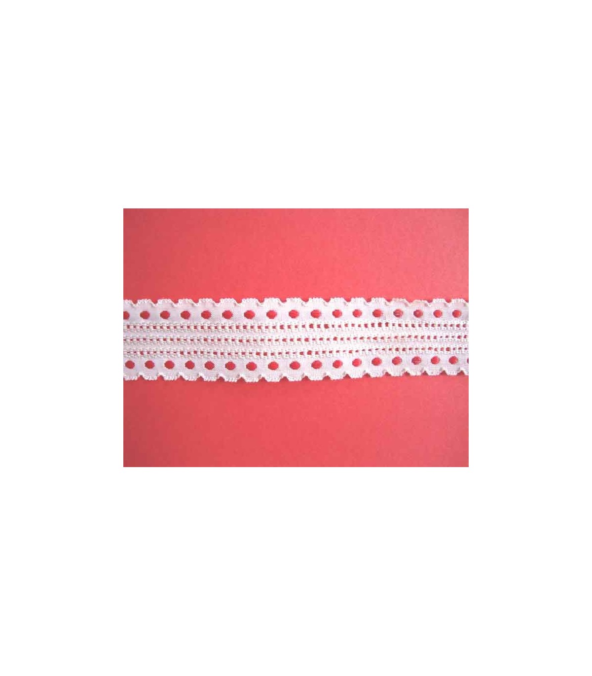 Bundel met 2 mtr. sierband, offwhite met 2 rijen rode stipjes en 3 rijen iets doorschijnende gaatjes