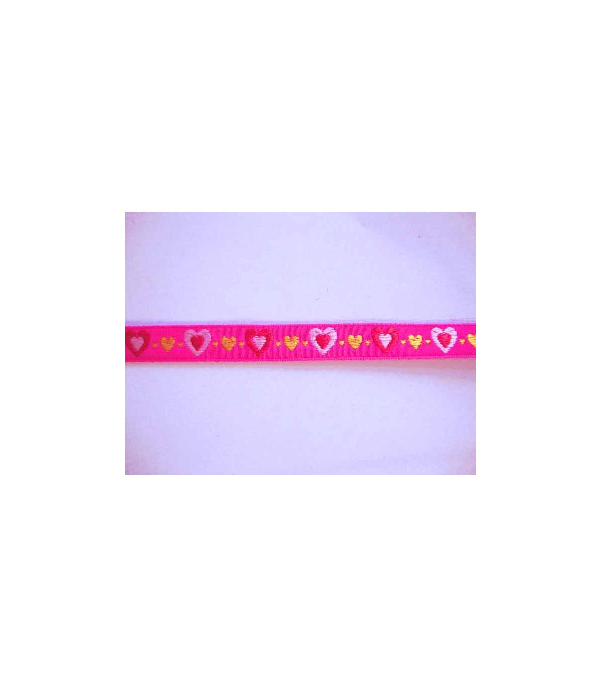 Pinkkleurig sierband met roze rood en gele hartjes.
