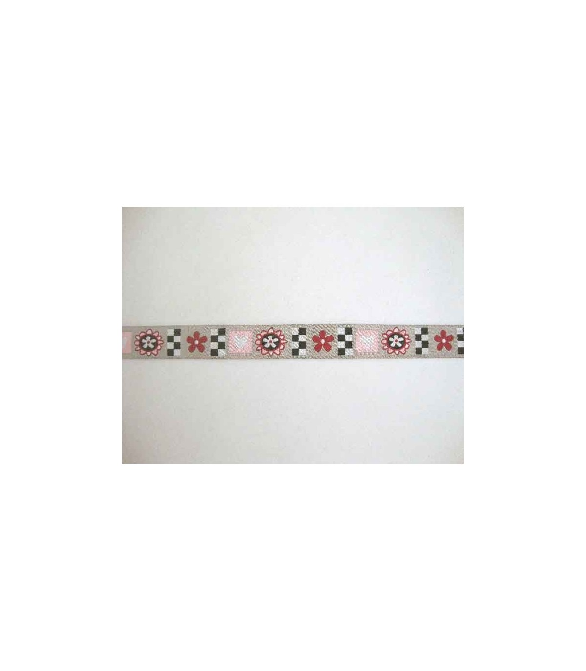 Sierband Hartjes Lichttaupe met zwart-rood-roze patroon 15mm.