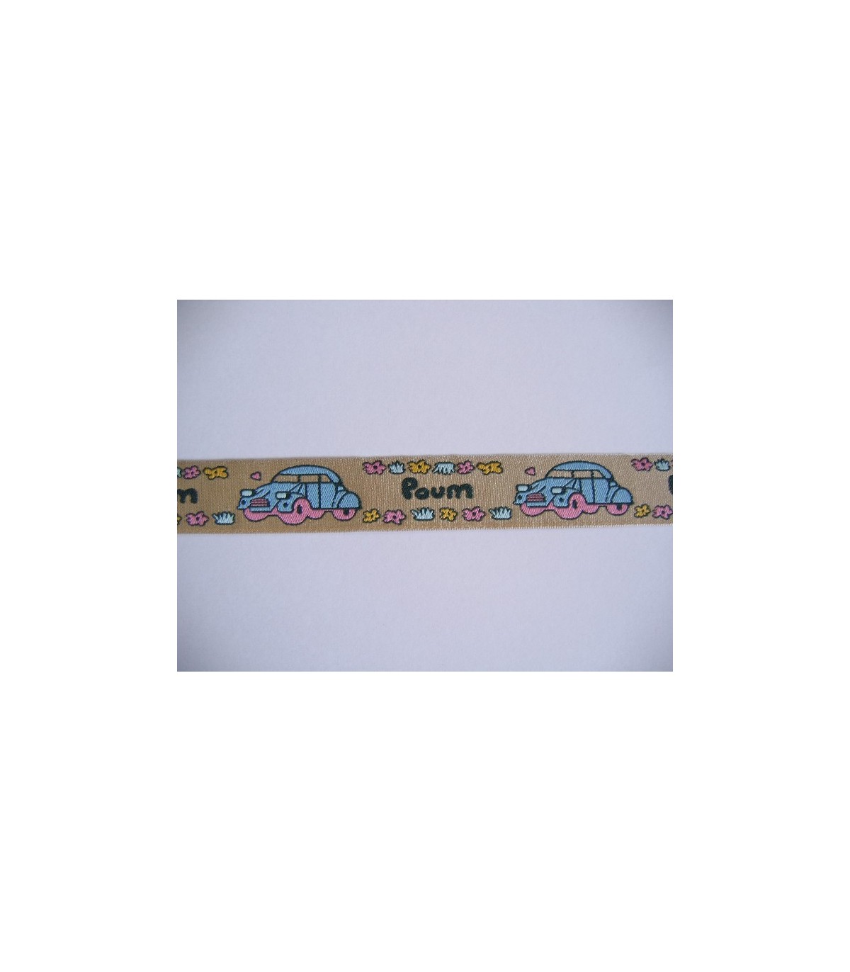 Zandkleurig sierband met een lichtblauwe auto en de tekst Poum.