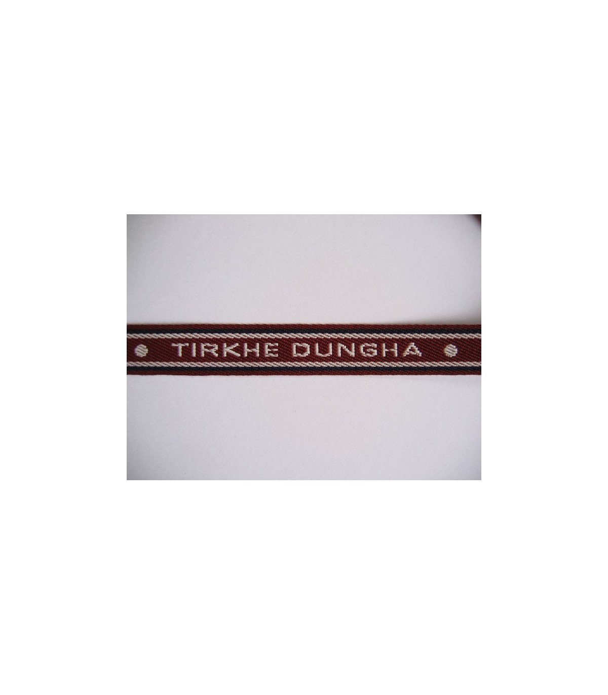 Bordeaux/cremekleurig sierband met de tekst Tirkha Dungha.