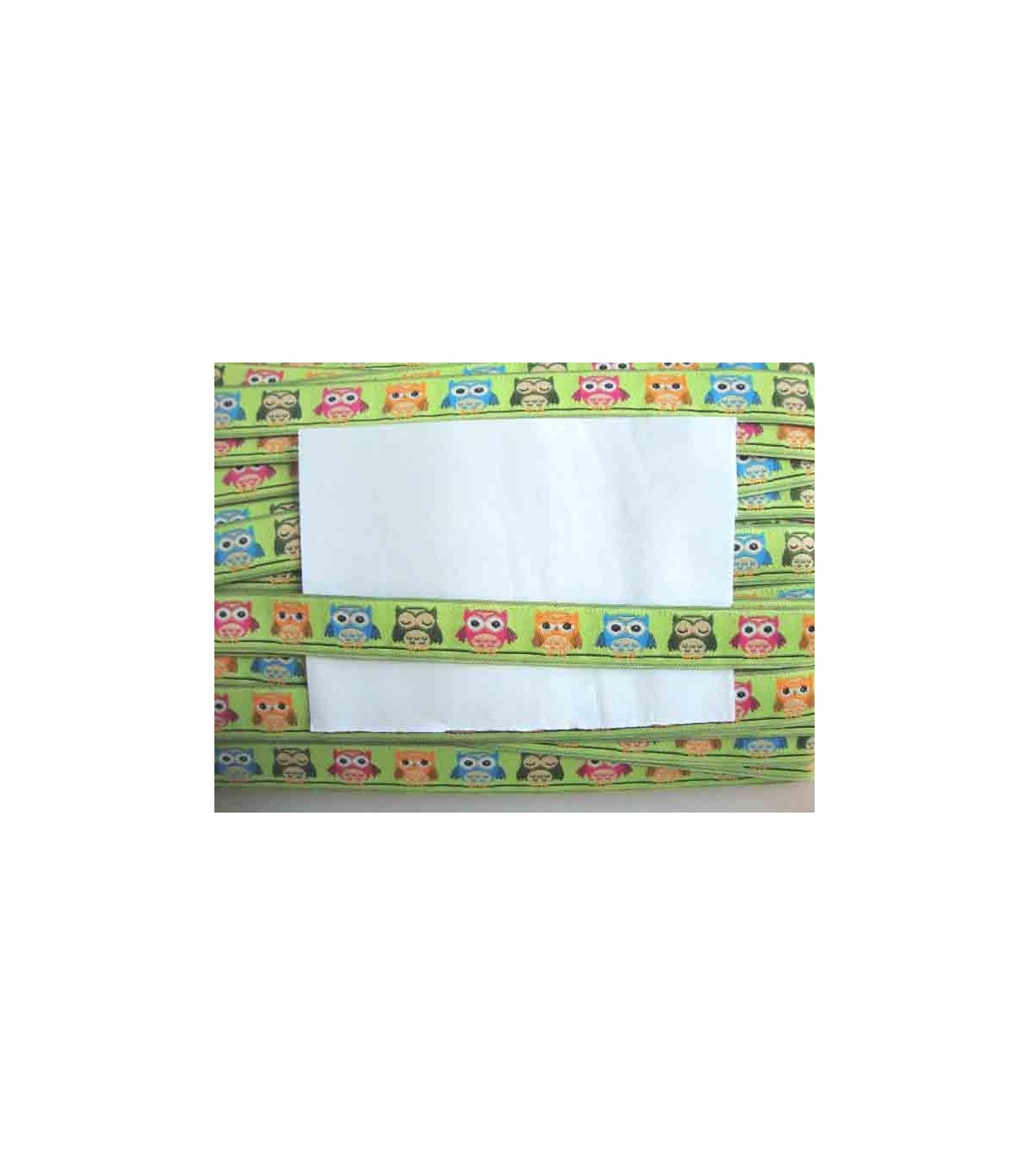 Lime kleurig sierband met aqua, groen, oranje en pinkkleurige uilen.