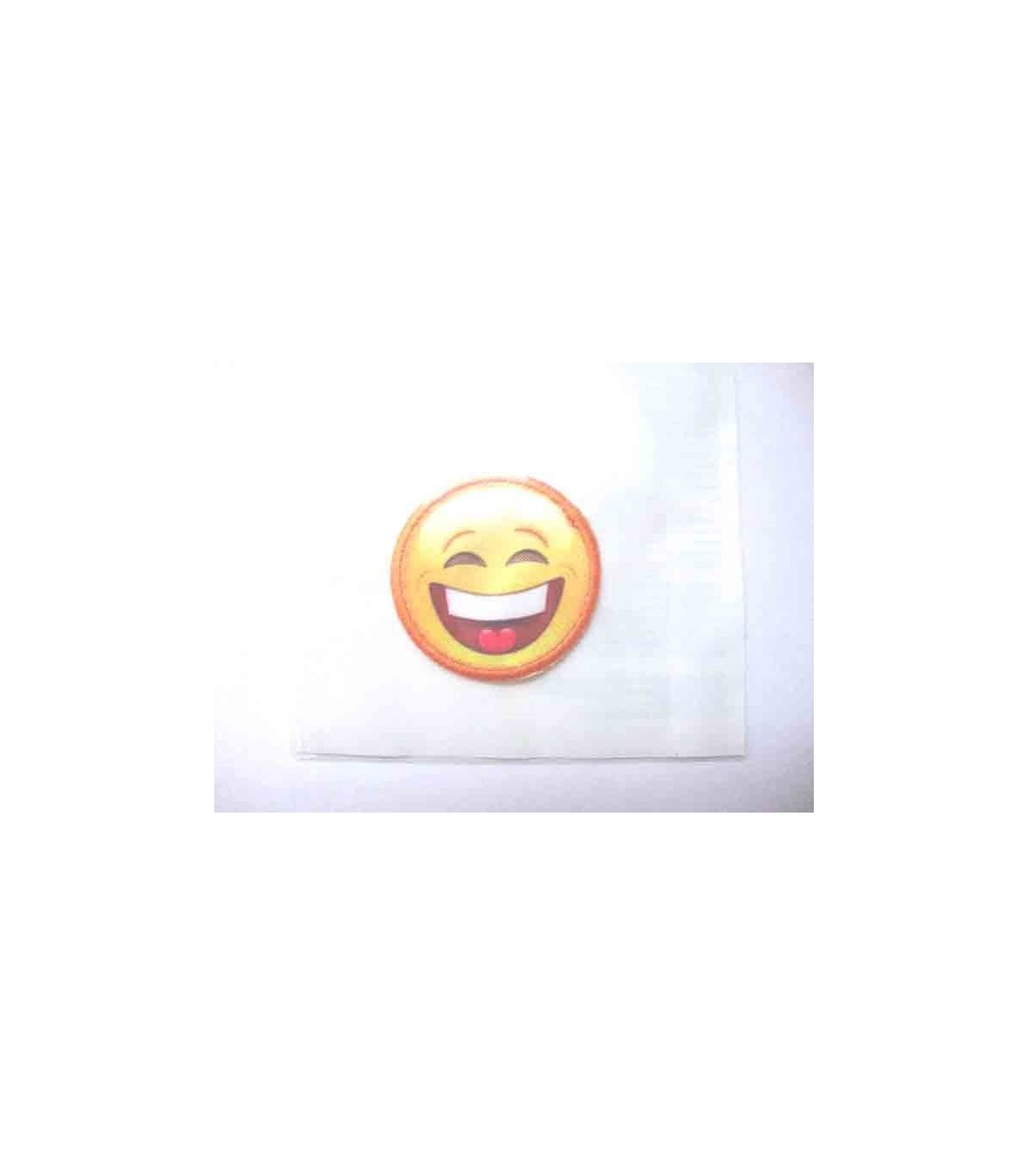 Een opstrijkbare smiley emoticon met een doorsnee van 4 cm.