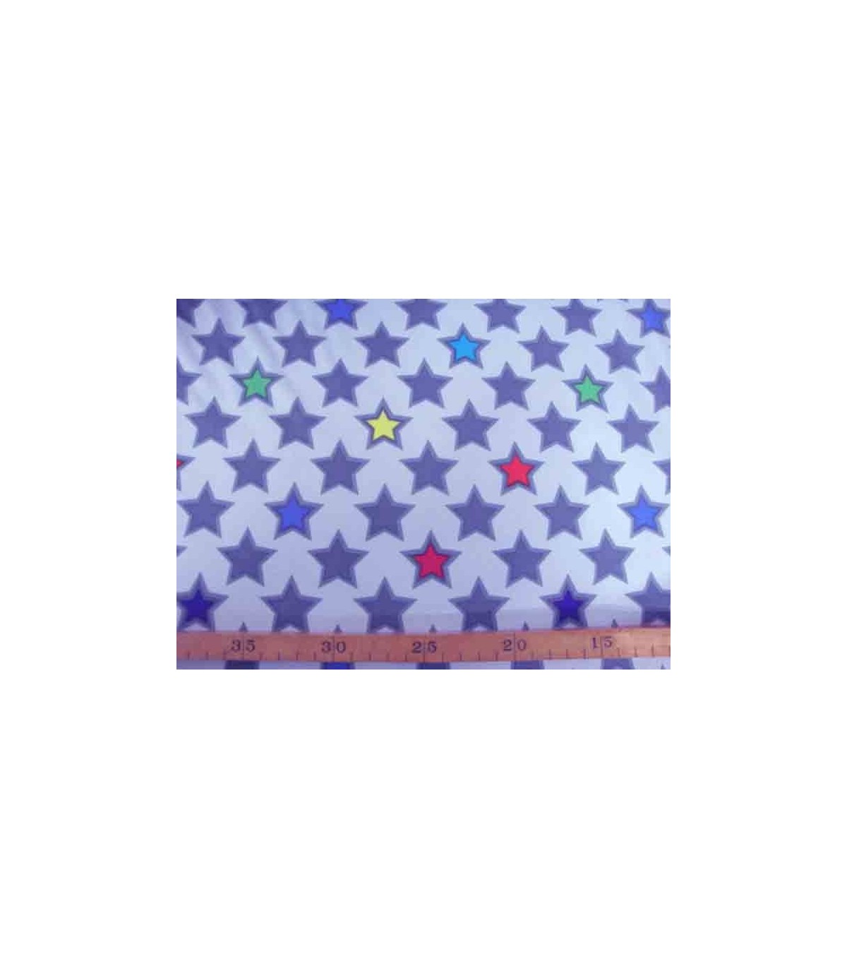 Een lichtgrijze shoftshell met diversen gekleurde sterren. De stof is wind en waterdicht en rafelt niet.