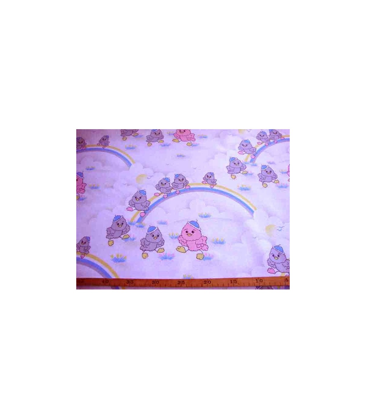 Tafelzeil van geplastificeerd katoen, wit/grijs met een regenboog en kuikens.
