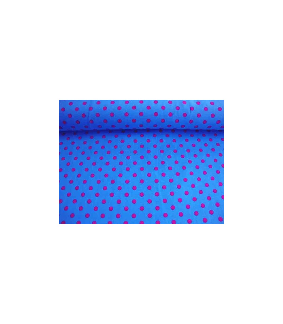 Een aqua kleurige katoen met pink kleurige stippen. De stip heeft een doorsnee van 7 mm.