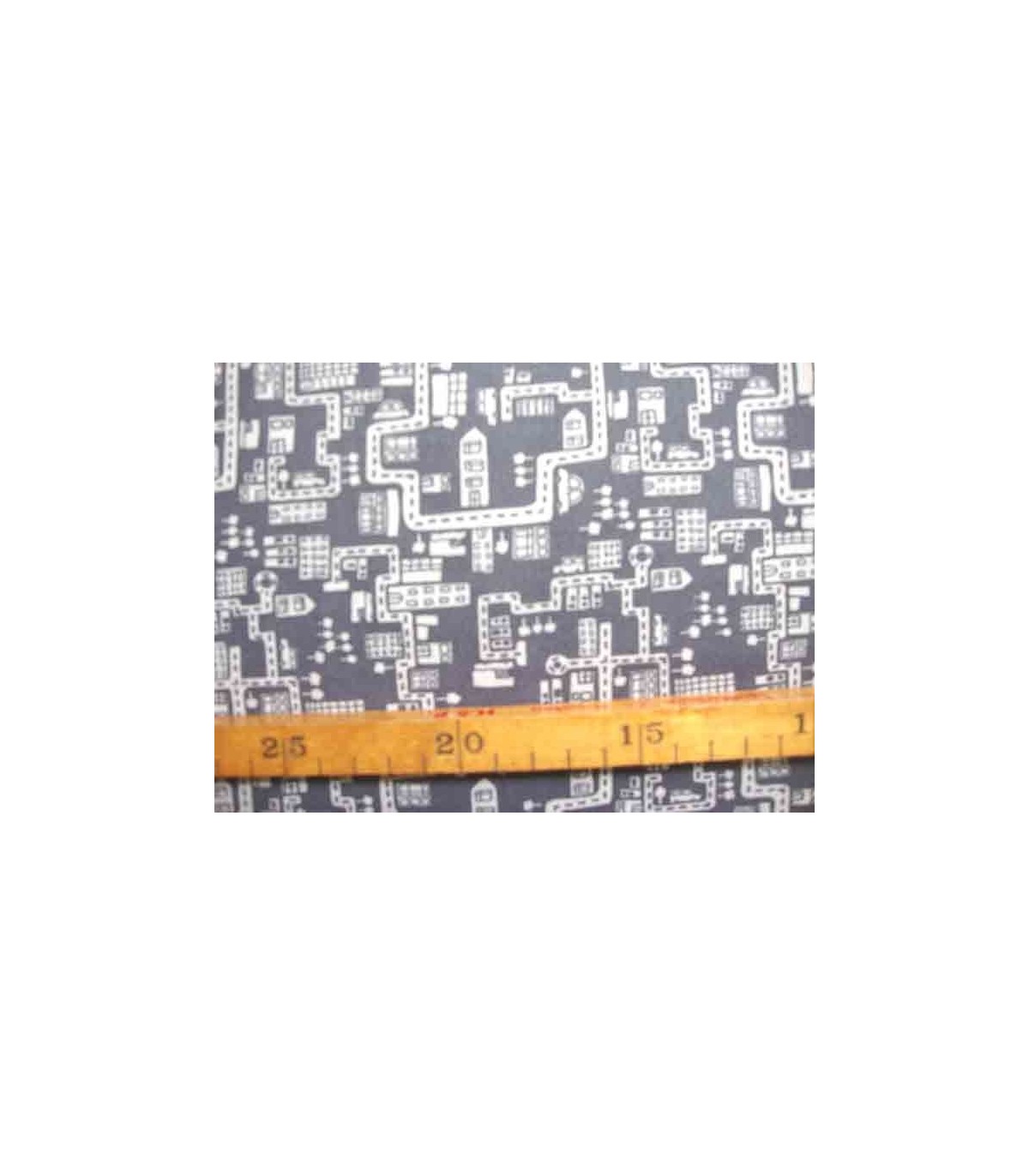 Een donkergrijze katoen met lichtgrijze straatjes en huisjes.