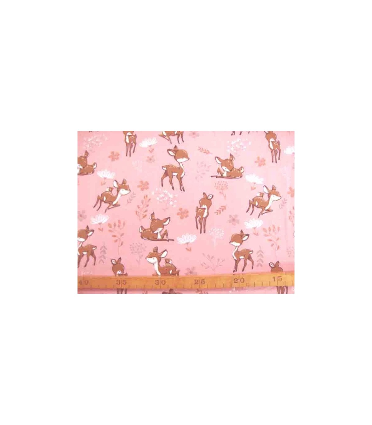 Een oudroze tricot met hertjes Rekt in de breedte en in de lengte. Huidvriendelijk, milieuvriendelijk en kindvriendelijk geproduceerd.