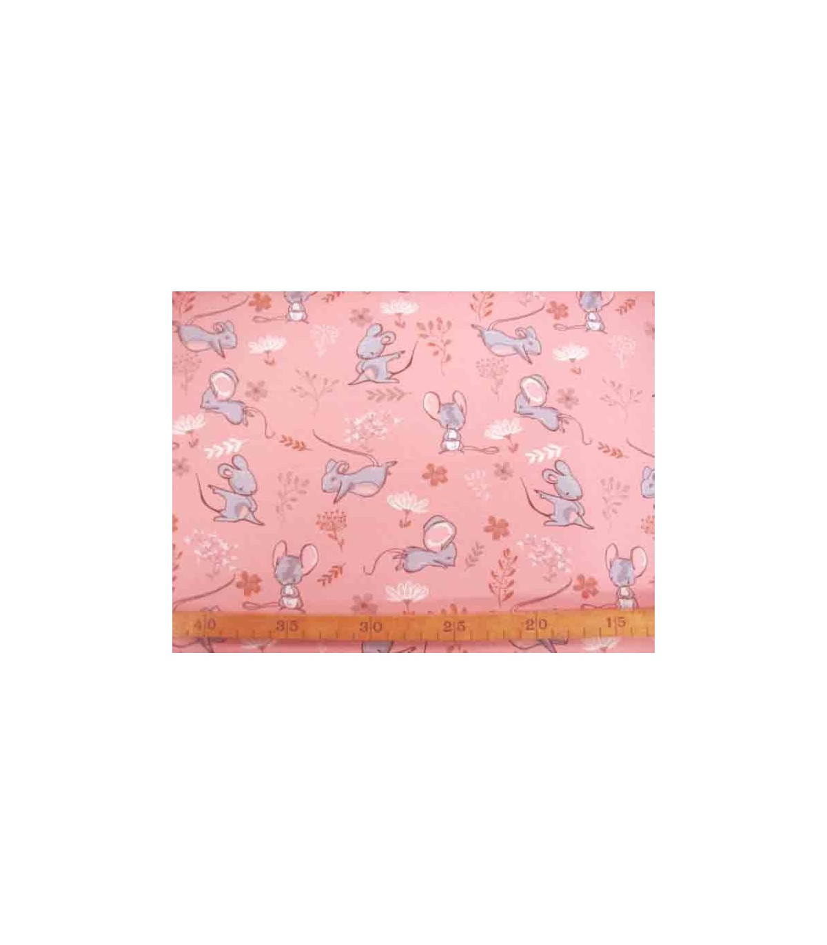 Een oudroze tricot met muisjes. Rekt in de breedte en in de lengte. Huidvriendelijk, milieuvriendelijk en kindvriendelijk geproduceerd.