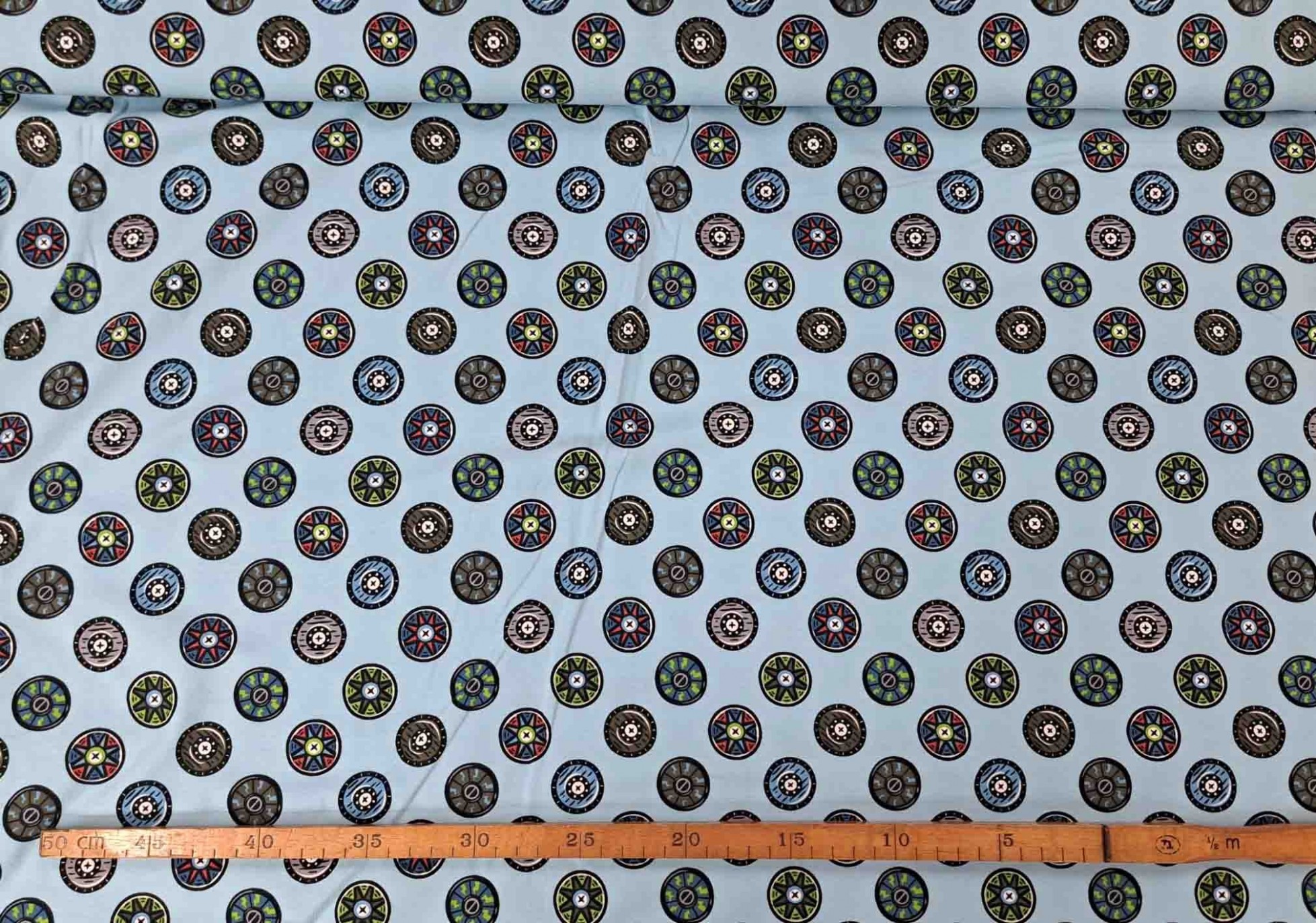 Een lichtblauwe tricot met een vikingschild print. Rekt in de breedte en in de lengte. Huidvriendelijk, milieuvriendelijk en kindvriendelijk geproduceerd.