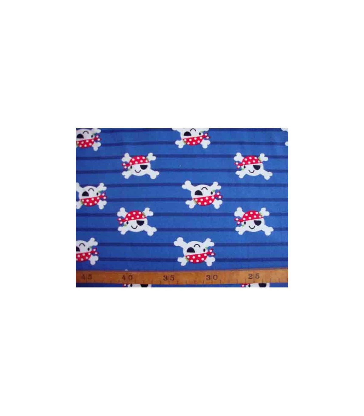 Tricot stof. Een blauw bedrukte breedtestreep met piraatjes. 95%co/5%el. 1.50 mtr.br.