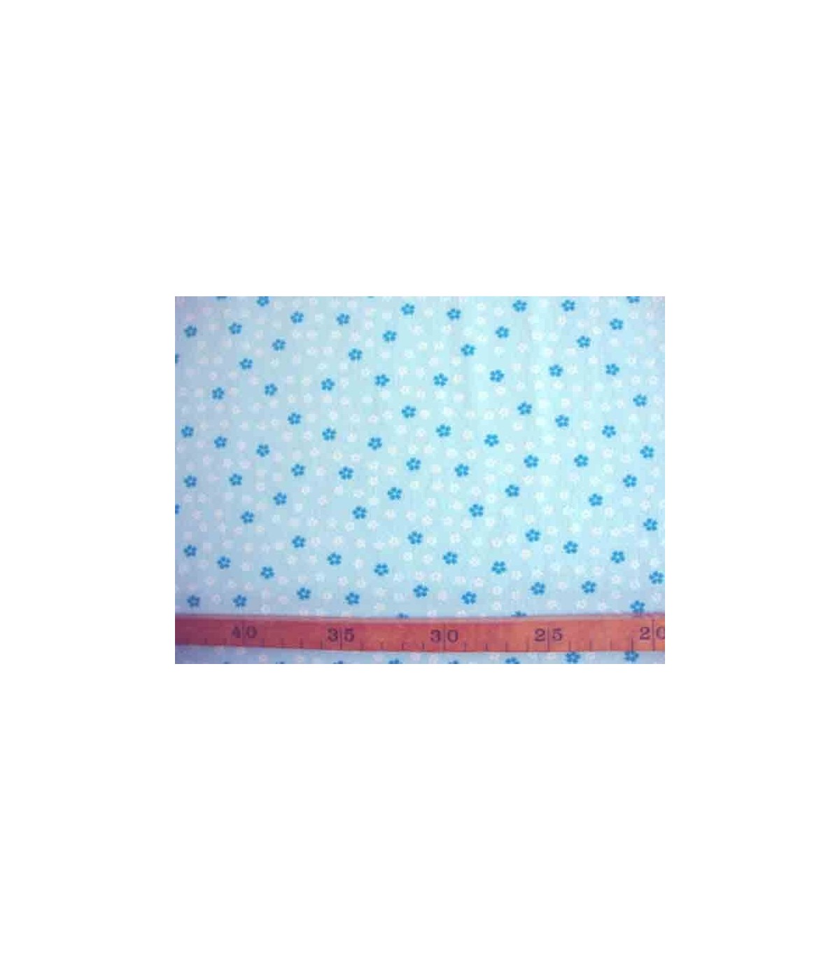 Een lichtblauwe bedrukte tricot met een petrol/witte minifleur. Rekt in de breedte en in de lengte 95%co/5%el. 1.50 mtr. br.
