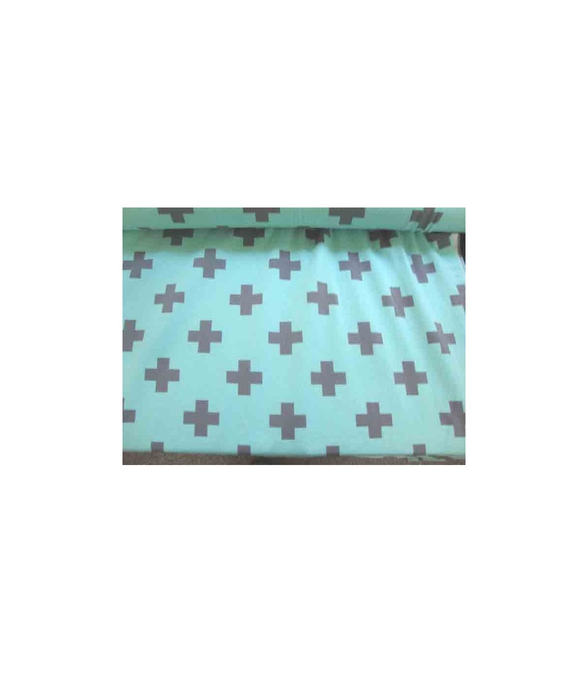 Een mintgroene tricot met een grijze plus. De plus is 4.5 x 4.5 cm. Rekt in de breedte en in de lengte.