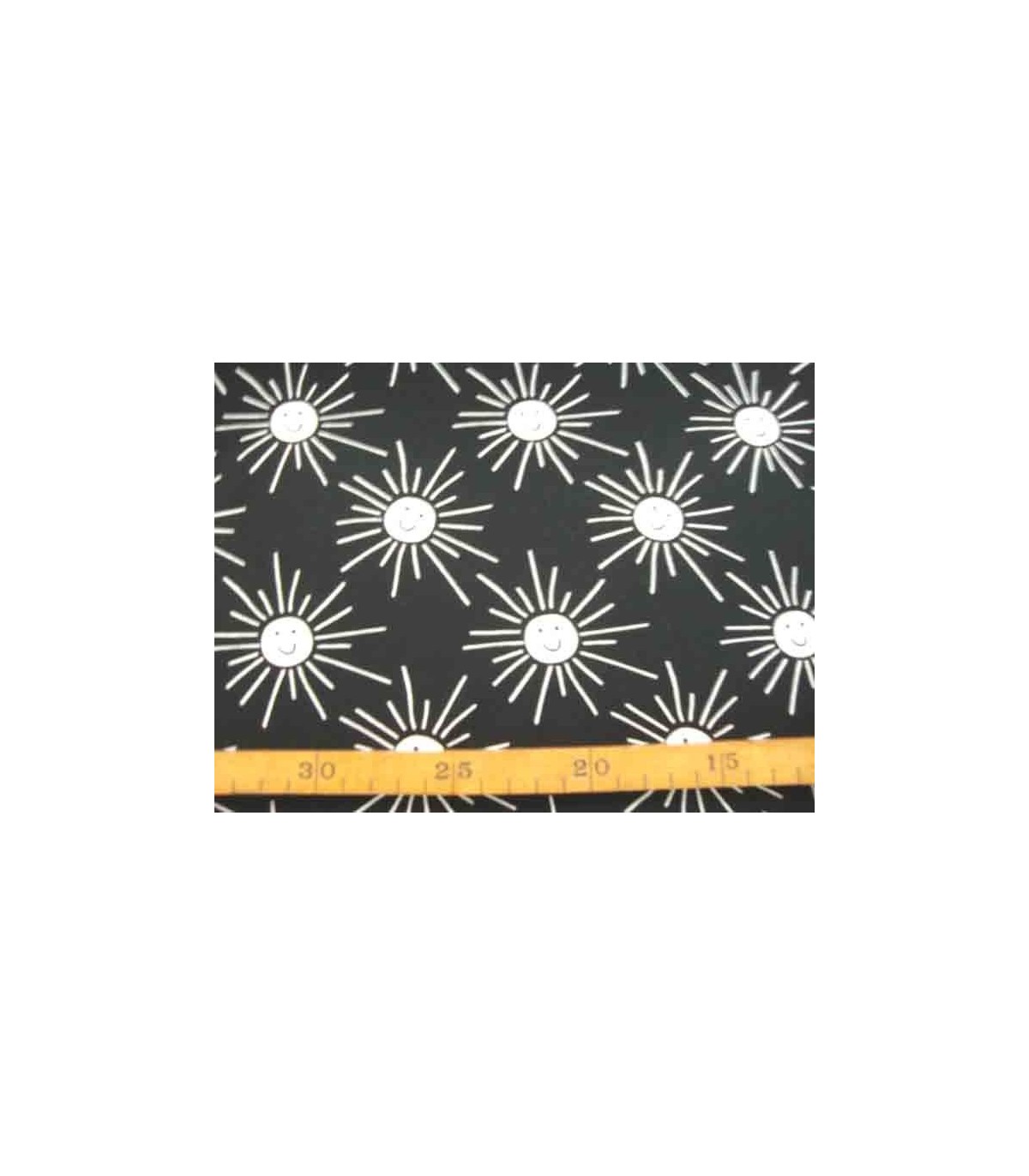 Een zwarte tricot met een wit zonnetje met een gezichtje en stralen. Rekt in de breedte en in de lengte.