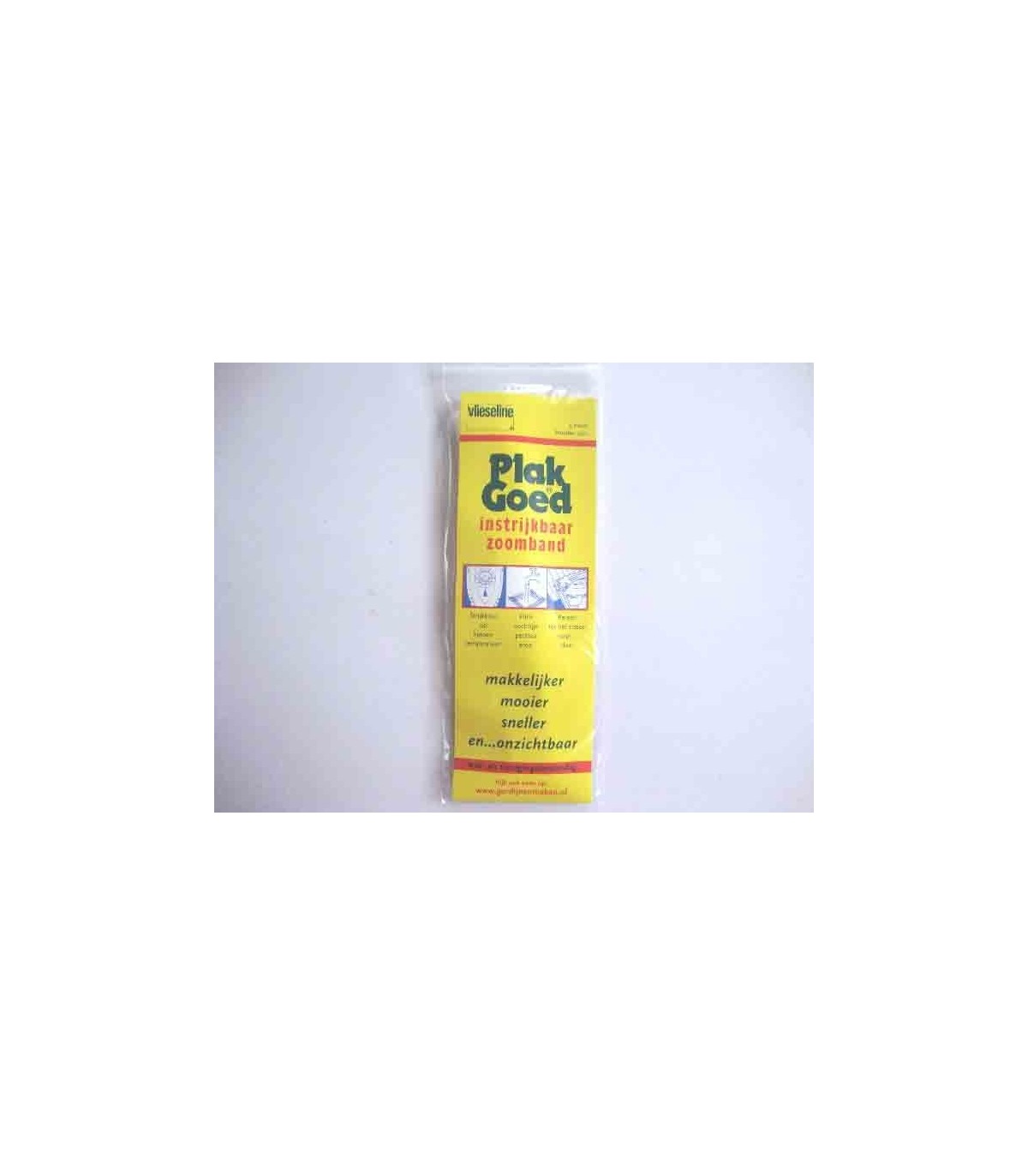 Instrijkbaar zoomband. 2 cm breed. Een pakje van 5 meter. Was en reinigingsbestendig. Op de achterkant staat de gebruiksaanwijzing.