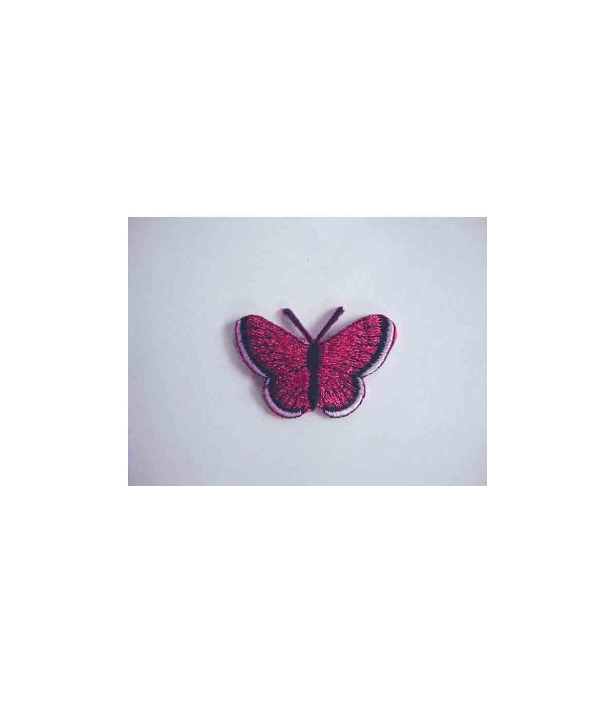 Een opstrijkbare vlinder applicatie van 5 x 3.5 cm. Donkerpink glitter