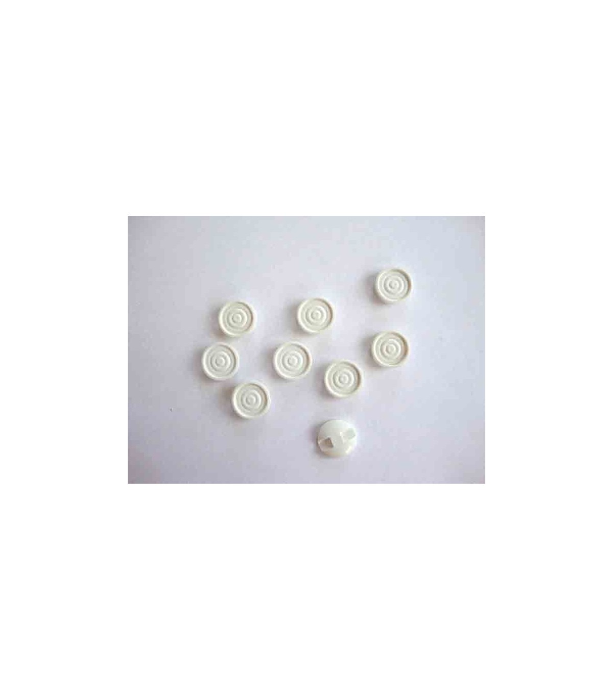 Een witte kunststof knoop met een doorsnee van 15 mm.