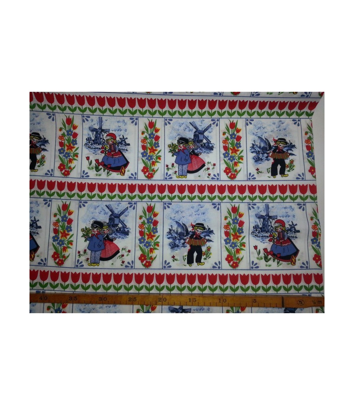 Delfts blauwe stof, gekleurd, met tulpen.