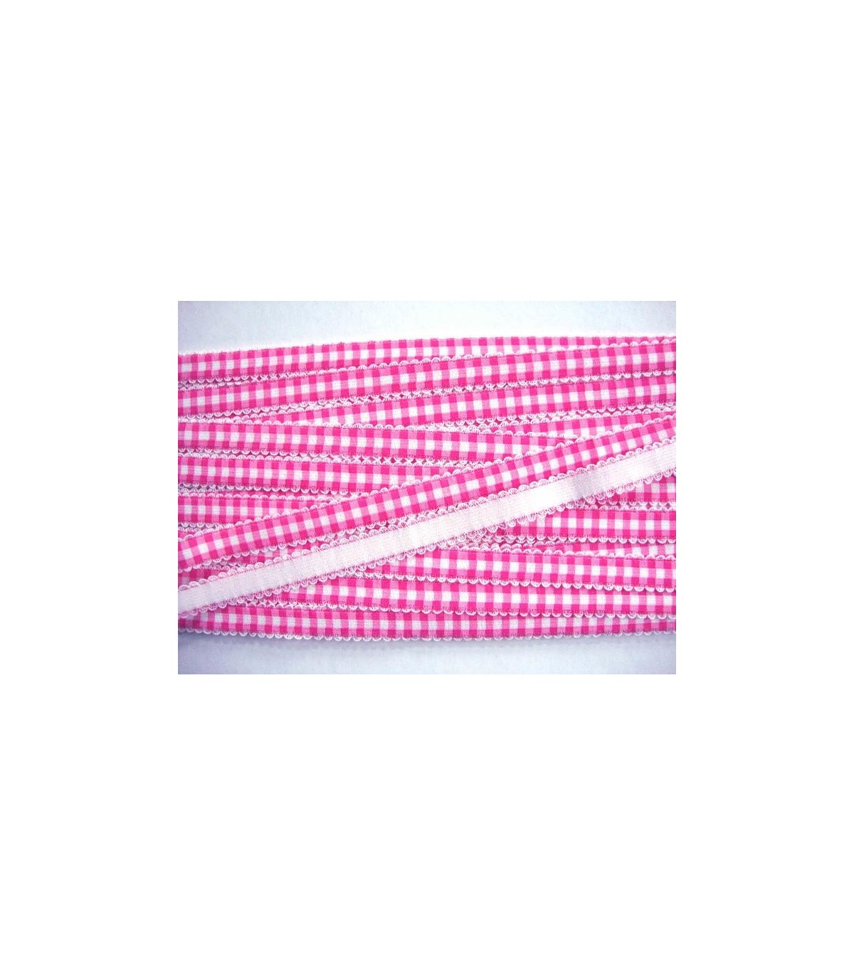 Pinkkleurig boerenbont elastisch band van 15 mm. breed.