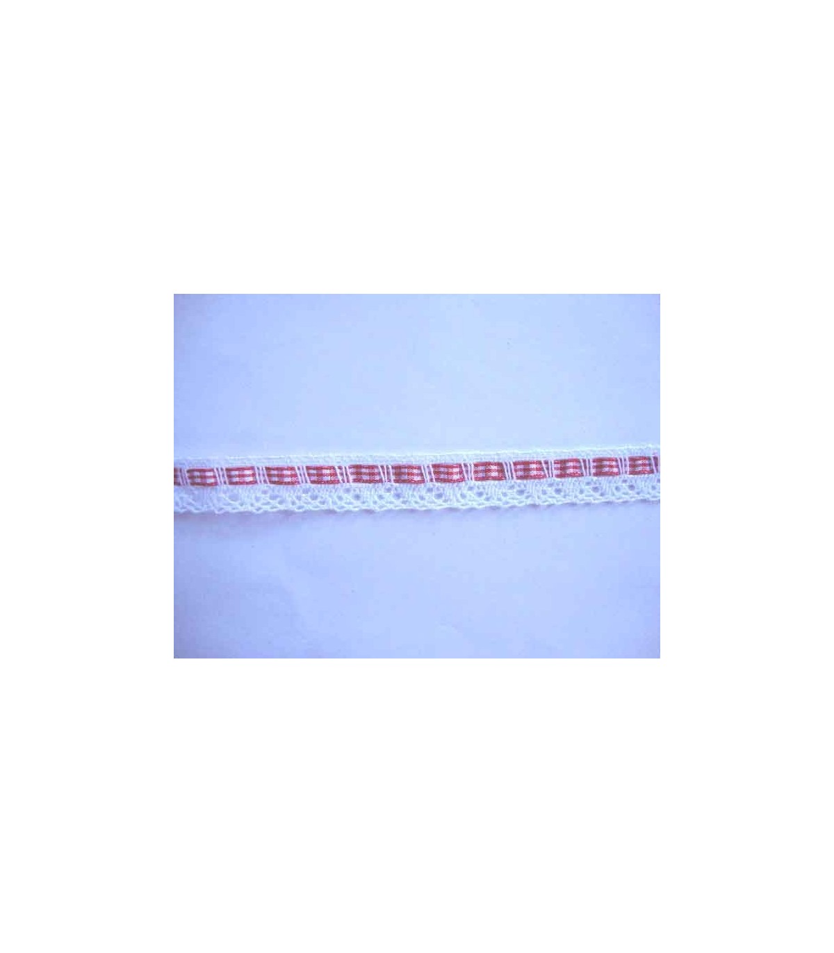 Wit kant met een rood/wit geblokt lintje erdoor geregen. 2 cm. breed