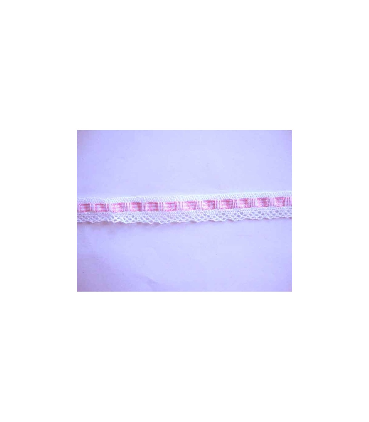 Wit kant met een roze/wit geblokt lintje erdoor geregen. 2 cm. breed