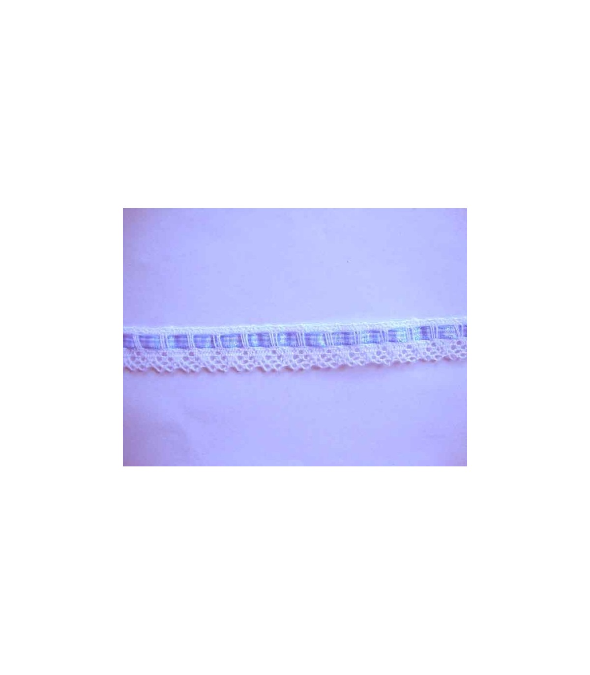 Wit kant met een lichtblauw/wit geblokt lintje erdoor geregen. 2 cm. breed